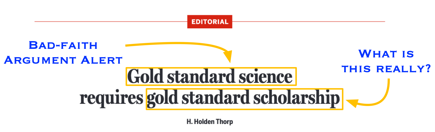 The Editor-in-Chief of Science Magazine, Holden Thorp, released an Editorial on Thursday 9/18 entitled “Gold standard science requires gold standard scholarship.” The central premise is to equate (accusations of sometimes sloppy) citation practice in scientific research with that of deliberate research misconduct. In doing so, the Editorial takes the administration’s banner of ‘gold standard science’ and proposes that stricter enforcement of ‘gold standard scholarship’ is required to fix perceived ills in the science ecosystem. I argue that the Editorial takes the administration’s bad-faith argument and runs with it – abetting an anti-science movement with policy recommendations that have the potential for misuse to the detriment of science.
