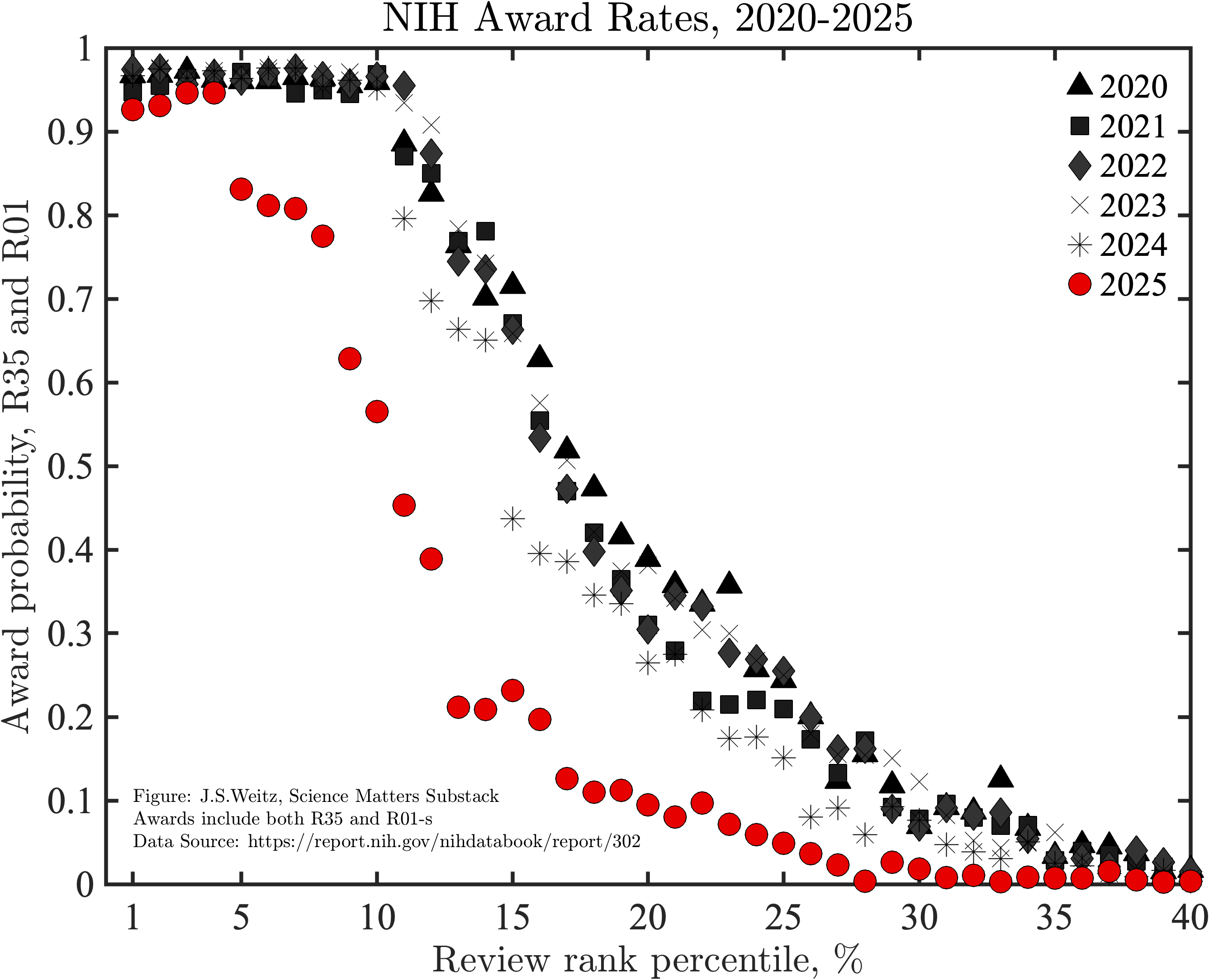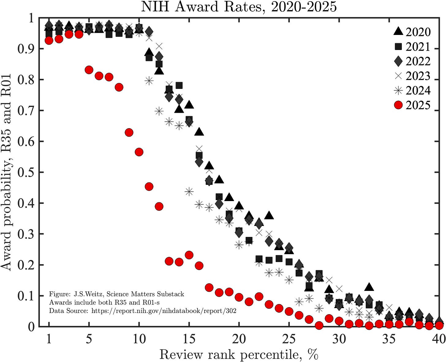 The graph shows the probability that a grant will be funded as a function of the review rank percentile. For insiders and practicing scientists, this plot is profoundly troubling. For those unfamiliar with the nuances of NIH reviewing – the data shows evidence of a significant, downward shift in award rates in 2025 for highly reviewed grants leading to fewer awards, less science, and a pending crisis in biomedical research. This post unpacks the interpretation, key causes, and likely consequences of this failure by NIH to commit to fund highly reviewed research proposals.